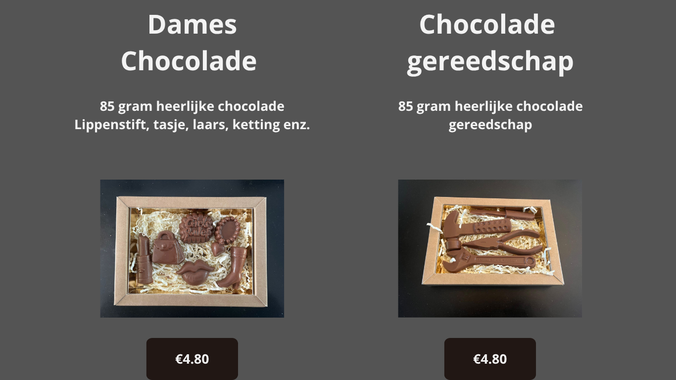Een volledig chocoladecadeau is natuurlijk ook mogelijk. Bekijk hieronder alle opties; dit zijn slechts enkele mogelijke combinaties.
