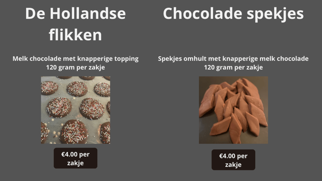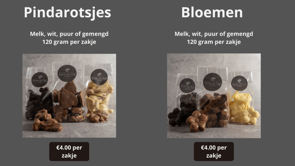 Bestellen kan eenvoudig door contact op te nemen via het contactformulier of door te whatsappen. Je kunt je bestelling gemakkelijk ophalen in Uden of laten thuisbezorgen, zodat je er direct van kunt genieten. Of je nu een chocolade liefhebber bent of gewoon op zoek bent naar een verrassing voor een vriend of familielid, onze producten bieden de perfecte oplossing.