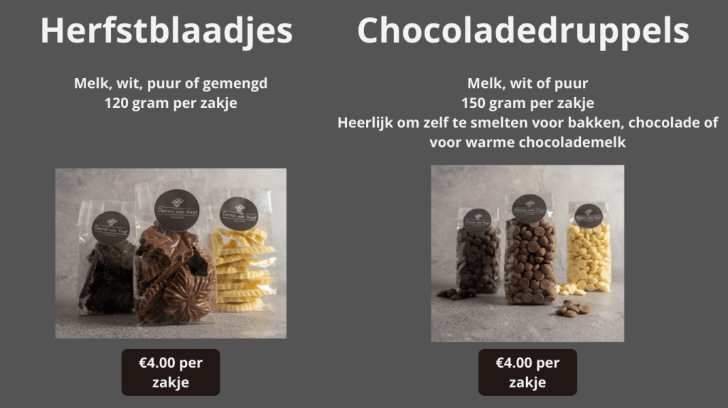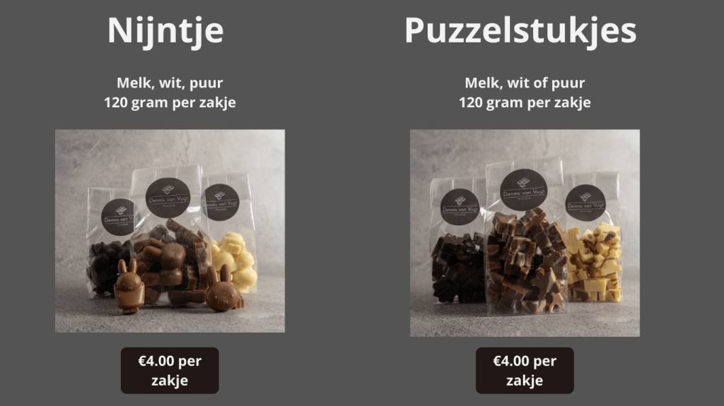 Bekijk hieronder de mogelijkheden voor het bestellen van alle zakjes massieve chocolade